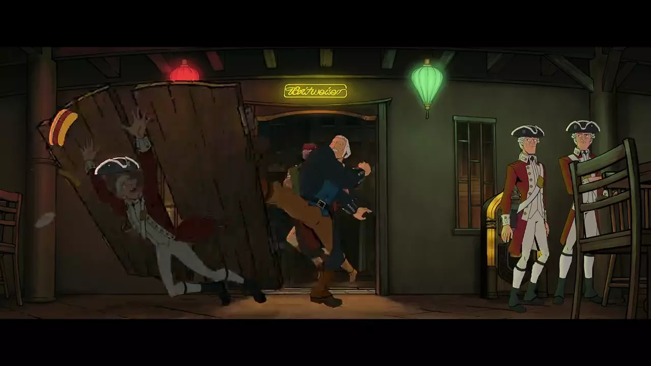 A chainsaw-wielding George Washington teams with beer-loving bro Sam Adams to take down the Brits in a tongue-in-cheek riff on the American Revolution.