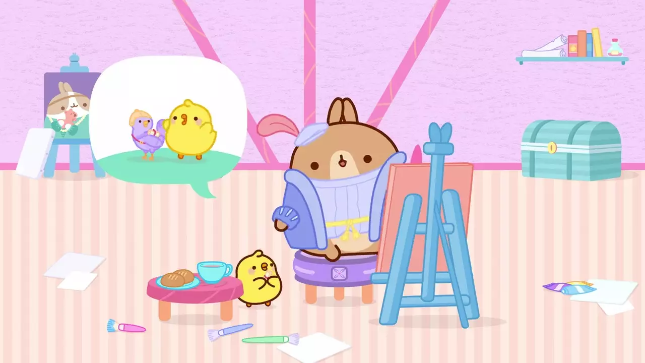Molang is an affectionate and humorous perspective on the relationship between an eccentric, joyful and enthusiastic rabbit, and a shy, discreet and emotional little chick. Despite their many differences, these two enjoy a unique friendship. They have great times together ranging from the mundane to the extraordinary. Whether they're flying to the moon or merely watering the vegetable patch, Molang and Piu Piu experience unexpected, even unsettling situations. Tricky incidents and misunderstandings are soon transformed into opportunities for fun moments and humor, which Molang's friends are happy to come and share in.