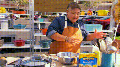 Alex Guarnaschelli hosts as chefs square off in a competitive pop-up kitchen outside a grocery store. To make their challenge dishes, the chefs must size up shoppers as they exit the store and negotiate for their grocery bags.